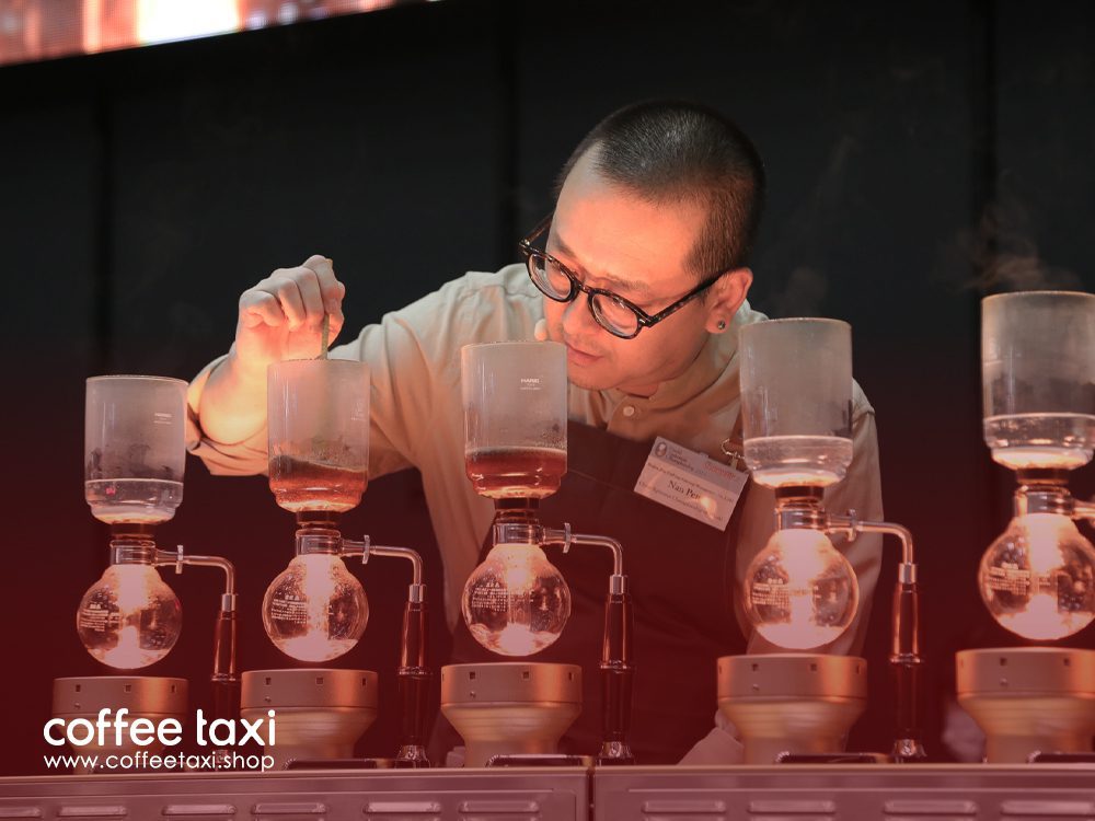 هی‌رونا یاماموتو (Hirona Yamamoto)، باریستا در LiLo Coffee Roasters  واقع در اوزاکای ژاپن، در حال آماده‌سازی خود برای مسابقات جهانی سایفونیست (World Siphonist Championship) است. در این رقابت، شرکت‌کنندگان باید سه سایفون و سه نوشیدنی ویژه را در مدت ۱۵ دقیقه دم‌آوری کنند.